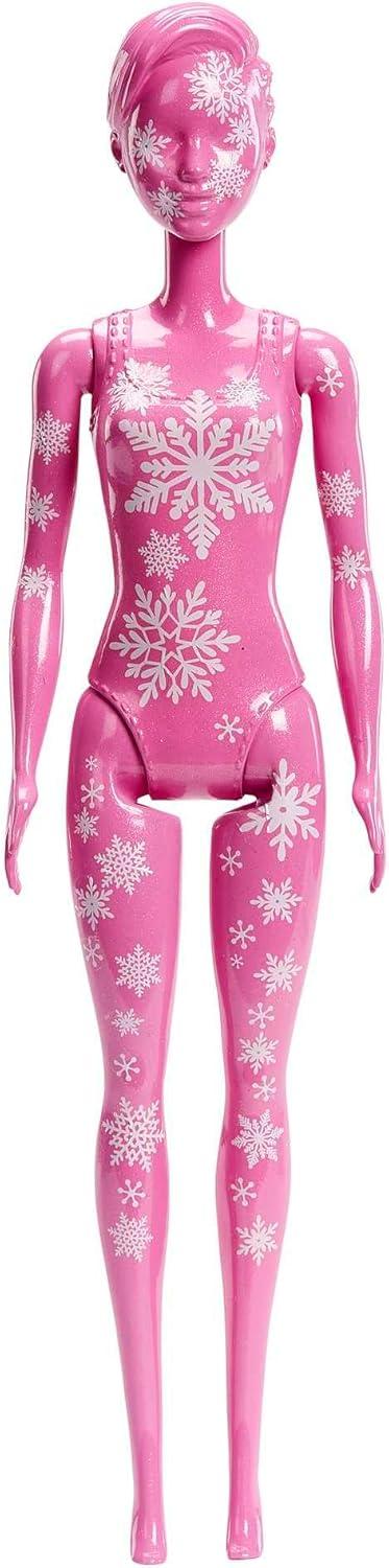 On day 1, start the reveal experience by removing the inner tube and unscrewing the top, then pull out a Barbie doll covered from head to toe in a Color Reveal pink coating with snowflakes!