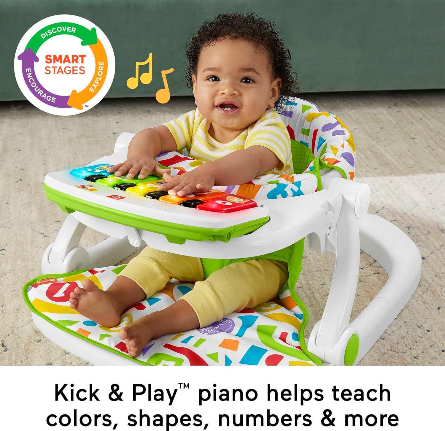 The Fisher-Price Kick & Play Deluxe Sit-Me Up Seat combines the extra support babies need to sit up and explore the world with the exciting musical learning fun of a Kick & Play piano. The soft, wide-legged seat helps your baby sit up and snack on the dishwasher-safe tray or bat and kick the piano to activate colorful lights, music, and learning fun that grows along with them. Max. weight 25 lb/ 11,3 kg. Use only with a child who is able to hold head up unassisted and who is not able to climb out or walk.