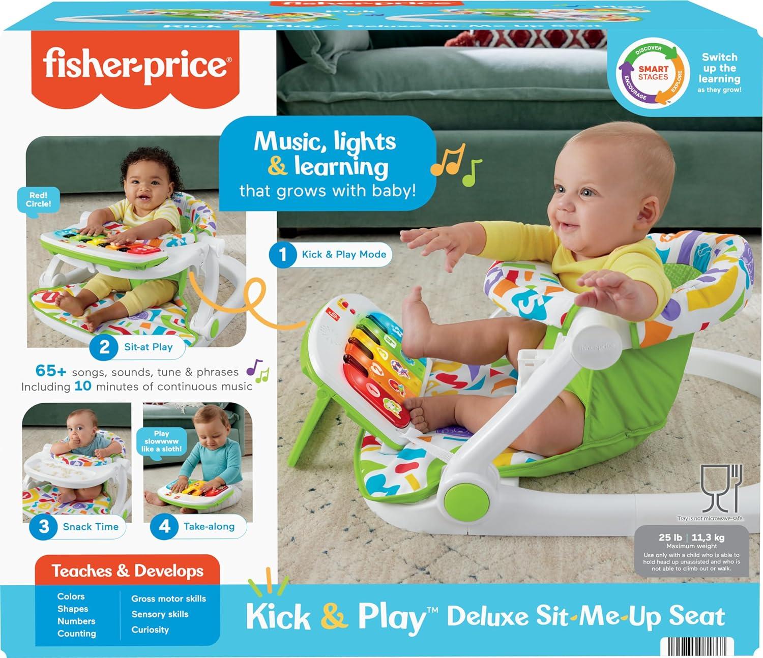 The Fisher-Price Kick & Play Deluxe Sit-Me Up Seat combines the extra support babies need to sit up and explore the world with the exciting musical learning fun of a Kick & Play piano. The soft, wide-legged seat helps your baby sit up and snack on the dishwasher-safe tray or bat and kick the piano to activate colorful lights, music, and learning fun that grows along with them. Max. weight 25 lb/ 11,3 kg. Use only with a child who is able to hold head up unassisted and who is not able to climb out or walk.