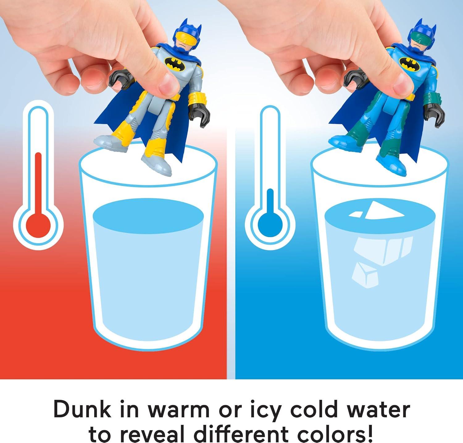 Action-Packed Super Hero versus Super-Villain adventures get an exciting new twist with this color-changing Imaginext DC Super Friends Color Changers figure set from Fisher-Price. Fill the included cannister with either warm or icy cold water and drop Batman and Two-Face inside to see the figures change color! Kids can collect additional Imaginext DC Super Friends Color Changers figure sets for more exciting pretend play. (Each sold separately and subject to availability.) Colors and decorations may vary.