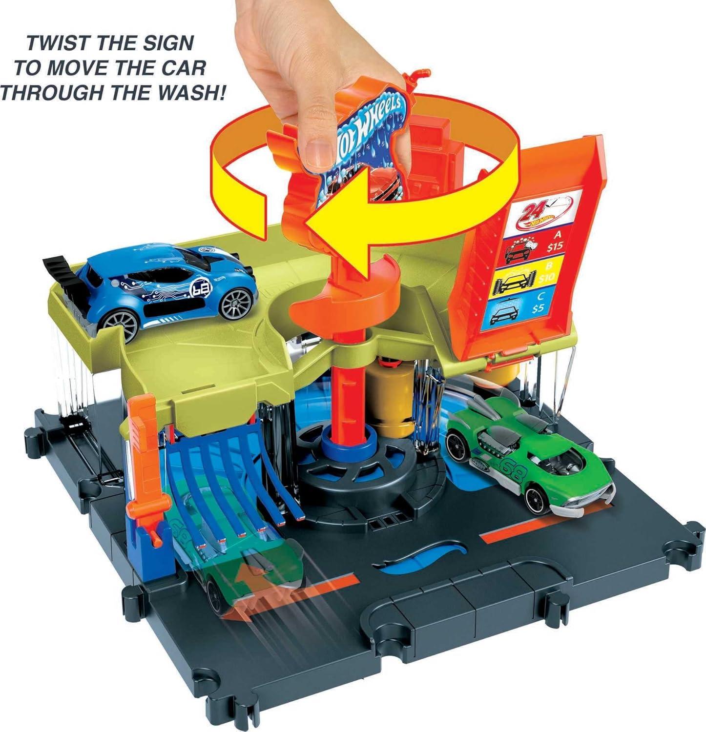 Hot Wheels City Toy Track Set, Downtown Express Car Wash Playset with 1:64 Scale Vehicle, Foam Roller & Drying Flaps